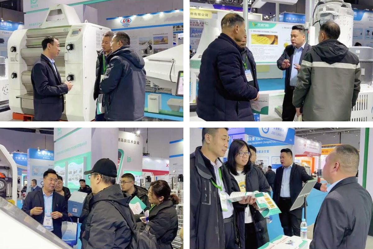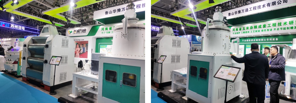展臺(tái)上,華豫萬通展出的智能玉米揉搓脫胚機(jī)、智能玉米胚芽搓光機(jī)、智能玉米選胚機(jī)、氣動(dòng)伺服磨粉機(jī)等玉米提胚制低脂玉米粉核心設(shè)備,以高品質(zhì)的外觀、高精尖的技術(shù)吸引了眾多參觀者的目光。該套核心設(shè)備能耗低、成品收率高、脂肪含量低、灰分低、綠色環(huán)保,可滿足葡萄糖、發(fā)酵企業(yè)的原料應(yīng)用。
