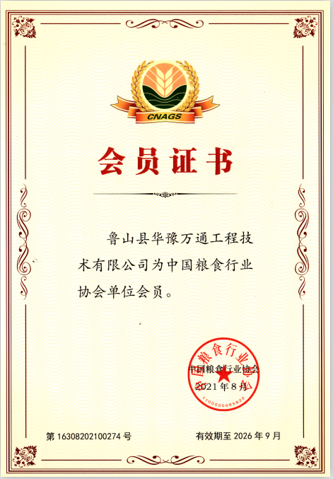 2021年8月,中國糧食行業(yè)協(xié)會經(jīng)多方位考察,授予魯山縣華豫萬通工程技術(shù)有限公司評會員單位稱號,并頒發(fā)會員單位證書。