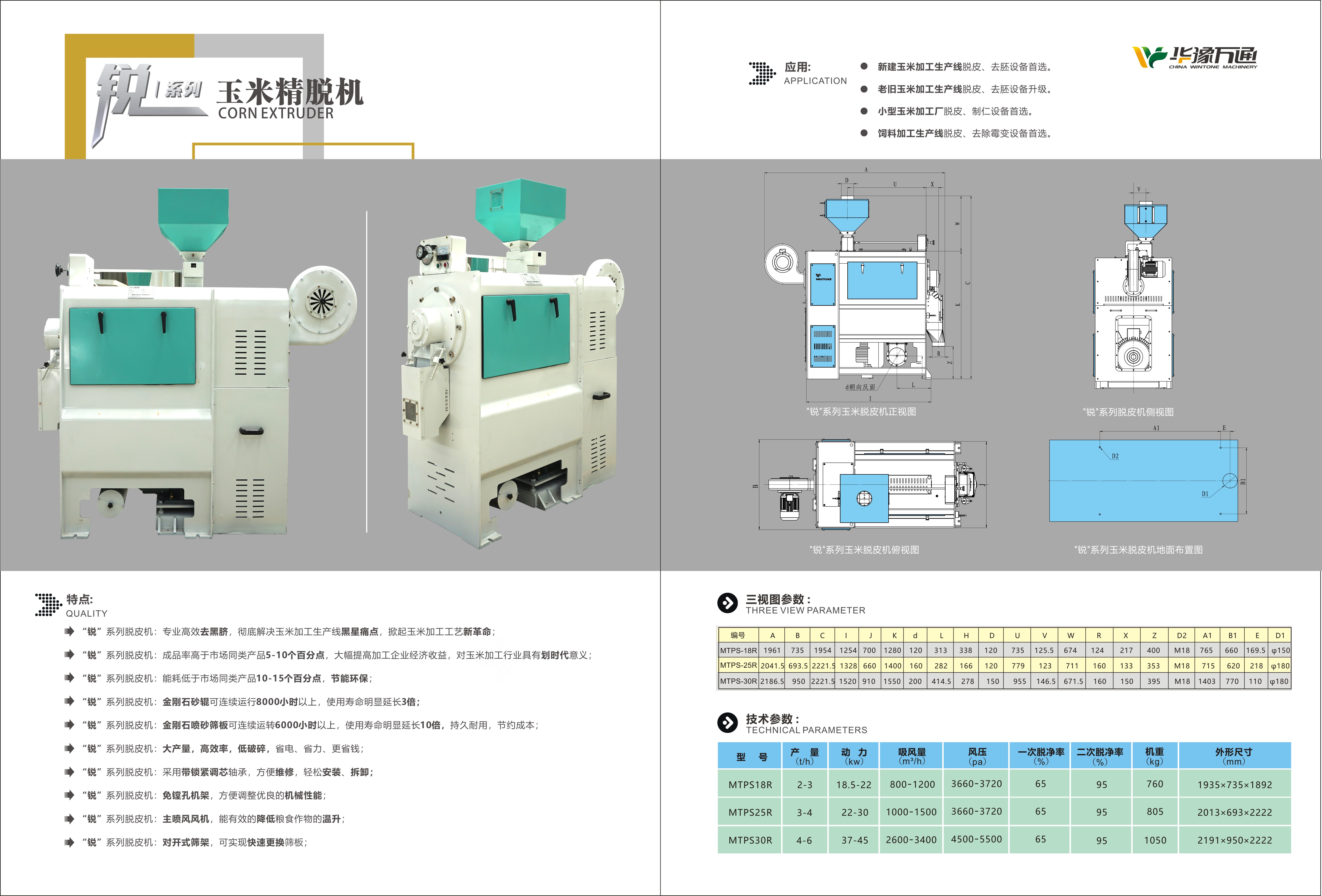 機(jī)器概述: 華豫萬(wàn)通“銳‘系列脫皮機(jī),摒棄傳統(tǒng)脫皮機(jī)“碾磨”的加工方式,采用“干式切削剝”技術(shù),可實(shí)現(xiàn)對(duì)玉米胚乳的分層精細(xì)切削剝離及胚芽的一次性剝除,從而達(dá)到對(duì)脫皮物料的很小破碎率和很佳脫皮效果。一次脫凈率60%,二次脫凈率達(dá)95%以上。 同時(shí),相對(duì)傳統(tǒng)脫皮機(jī),同樣功率, 產(chǎn)量提升1.5-2倍,節(jié)能降耗,迅速提升玉米加工企業(yè)利潤(rùn)點(diǎn)。同樣的產(chǎn)量比效果,同樣的效果比能耗。 機(jī)器應(yīng)用: *新建玉米加工生產(chǎn)線脫皮、去胚設(shè)備。 *老舊玉米加工生產(chǎn)線脫皮、去胚設(shè)備升級(jí)。 *小型玉米加工廠脫皮、制仁設(shè)備。 *飼料加工生產(chǎn)線脫皮、去除霉變及粗纖維設(shè)備。 機(jī)器圖片及參數(shù): 機(jī)器特點(diǎn): “銳”系列脫皮機(jī):專(zhuān)業(yè)高效去黑臍,解決玉米加工生產(chǎn)線黑星痛點(diǎn),掀起玉米加工工藝新潮流; “銳”系列脫皮機(jī):成品率高于市場(chǎng)同類(lèi)產(chǎn)品5-10個(gè)百分點(diǎn),大幅提高加工企業(yè)經(jīng)濟(jì)收益,對(duì)玉米加工行業(yè)具有意義重大; “銳”系列脫皮機(jī):能耗低于市場(chǎng)同類(lèi)產(chǎn)品10-15個(gè)百分點(diǎn),節(jié)能環(huán)保; “銳”系列脫皮機(jī):金剛石砂輥可連續(xù)運(yùn)行8000小時(shí)以上,使用壽命明顯延長(zhǎng)3倍; “銳”系列脫皮機(jī):金剛石噴砂篩板可連續(xù)運(yùn)轉(zhuǎn)6000小時(shí)以上,使用壽命明顯延長(zhǎng)10倍,持久耐用,節(jié)約成本;“銳”系列脫皮機(jī):大產(chǎn)量,低破碎,省電、省力、更省錢(qián); “銳”系列脫皮機(jī):采用帶鎖緊調(diào)心軸承,方便維修,輕松安裝、拆卸; “銳”系列脫皮機(jī):免鏜孔機(jī)架,方便調(diào)整出優(yōu)良的機(jī)械性能; “銳”系列脫皮機(jī):主軸噴風(fēng)風(fēng)機(jī),能有效的降低糧食作物的溫升; “銳”系列脫皮機(jī):對(duì)開(kāi)式篩架,可實(shí)現(xiàn)快速更換篩板; 產(chǎn)成品展示: 更多糧食加工設(shè)備:歡迎咨詢(xún)?nèi)A豫萬(wàn)通 :0371-86635901